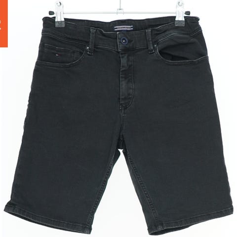 Et par grønne shorts. De har en knaplukning samt lynlås foran og bæltestropper. Der er to sidelommer foran og to baglommer. En lille detalje med Tommy Hilfiger-logo ved kanten af den ene lomme.