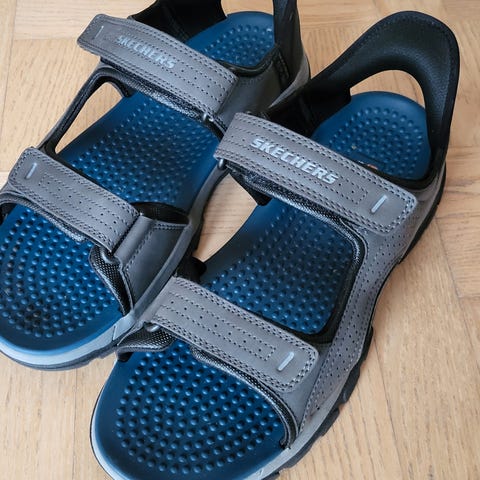 Disse sandaler fra Skechers er designet til børn, og er i størrelse 29. Sandalerne er lavet med en blå, sort og grøn camo design med synlig Skechers branding. De har en robust grå ydersål og justerbare remme, hvilket gør dem komfortable og sikre for små fødder. Sålens design og materialer gør dem ideelle til både leg og gåture. Skechers S-Lights logo kan ses på remmen.