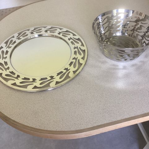 Alessi serveringsfad i rustfrit stål med et dekorativt geometrisk mønster langs kanten. Fadet har en blank finish og er fremstillet i Italien. Det er egnet til servering af mad og kan anvendes i køkkenet eller til borddækning.