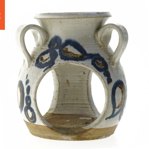 En dekorativ vase med en diameter på 15 cm. Vasen er lavet af keramik og har en rå tekstur med to håndtag på siderne. Den har en dyb grå farve med en lidt skrammet overflade, som giver den et rustikt look. Vasen kan bruges som en dekorativ genstand i hjemmet eller til at holde blomster og planter.