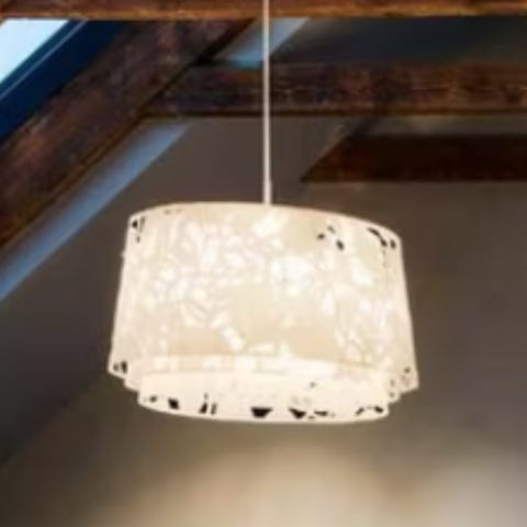 Lampen er lavet i laserskåret mat akryl med ophæng i naturanodiseret aluminium.