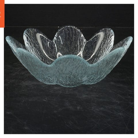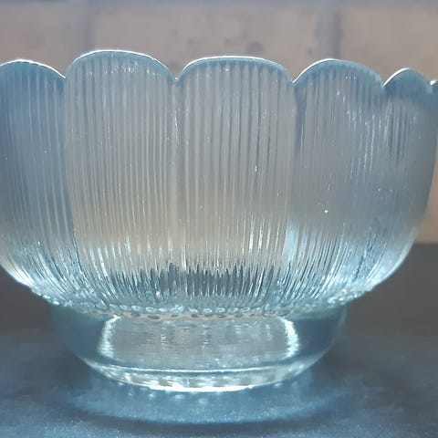 Denne skål er lavet af glas og har en unik, kunstnerisk form. Den er gennemskinnelig med en blålig tone og er velegnet til dekoration eller opbevaring af små genstande. Skålen har en størrelse på 5x12 cm.