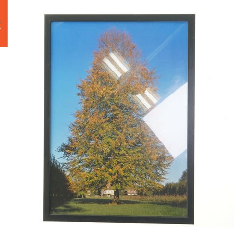 Dette er en plakat med et motiv af et stort træ i landskabet, indrammet med en sort ramme. Plakatens størrelse er 30x42 cm, og den har en robust bagside, der er udstyret med en tråd til ophængning. Bagsiden har et etiket med 'Posterland' på, hvilket indikerer hvor plakaten er fra. Tags: plakat, ramme, naturbillede, landskab