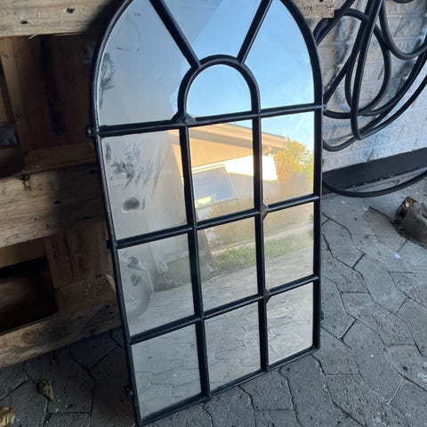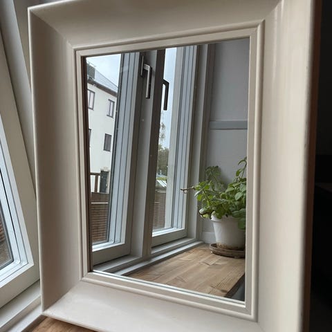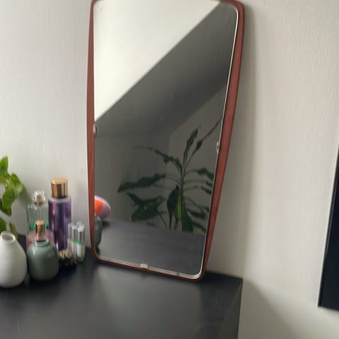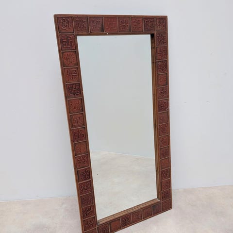 Retro Spejl med træramme, dekoreret med firkantede klinker langs siderne. Rammen er i naturlig træfarve og spejlet er rektangulært. Velegnet til ophængning på væg. 61×110