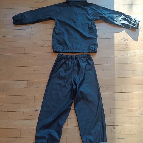 Sættet består af en sort jakke med aftagelig hætte og trykknaplukning samt sorte overalls med justerbare seler. Begge dele har elastikkanter ved ærmer og ben samt reflekterende stribe ved benene for øget synlighed.