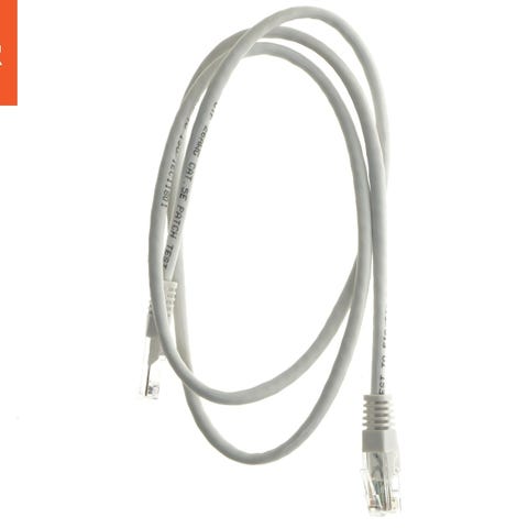Dette er et komplet Ethernet-kabel, typisk anvendt til netværksforbindelser. Kablet er hvidt med RJ45-stik i begge ender, påført med gule stikdæksler. Det ser ud til at være nogle meter langt, ideelt til brug i hjemmet eller på kontor til at forbinde computere, routere eller andre netværksenheder.