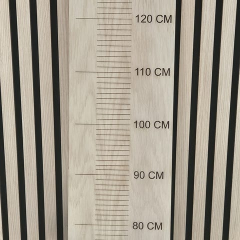 at måle højden af børn og voksne. Det leveres i en blå opbevaringskasse med klare instruktioner om brug og samling. Måleren inkluderer et sæt af hvide skalaer, der er designet til nem opsætning og nøjagtig måling.
