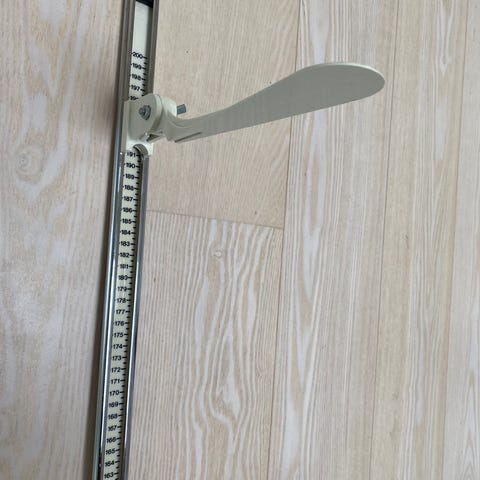 Leicester Height Measure Tanita højdemålet er fristående på en plastic fod, og personen står på foden af højdemåleren, så den står stabilt under målingen.