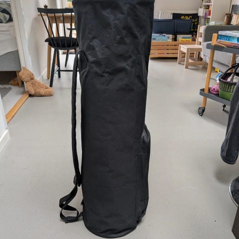 Tasken til yoga måtte er guldfarvet med en sort skulderrem, der gør den nem at bære. Den har et enkelt design og åbnes og lukkes med en snor i toppen. Størrelsen på tasken er 74x24 cm, hvilket passer perfekt til at opbevare og transportere en standard yoga måtte.
