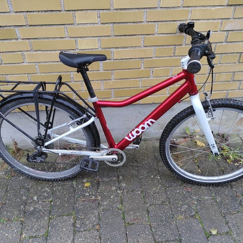 Woom 4 børnecykel med 20 tommer hjul. Med skærme, støtteben og bagagebærer - alle original fra Woom.