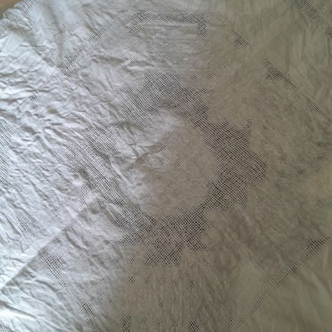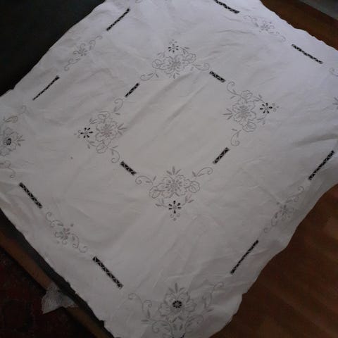 Gammel hvid dug 130 x 210 cm. Kraftigt vævet lærred med broderi og monogram i ene ende ( lagen) fin stand og uden pletter Dugen er vævet i to baner og har derfor en søm midt på. Denne kan evt dækkes af løber. Jeg har to ens. Stk 125). Begge 220kr ( skriv det som bud)