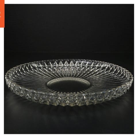 Et rundt glasfad med en diameter på 32,5 cm. Fadet har en dekorativ facetteret mønster som giver et elegant look. Perfekt til servering af frugt eller som dekoration.
