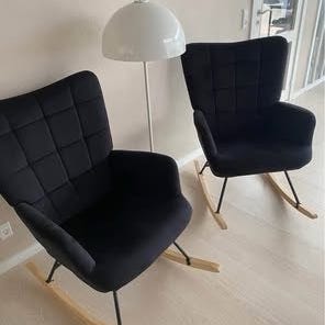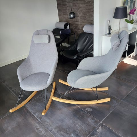 2 lysegrå gyngestole. Man sidder rigtig godt i dem. Fremstår super flotte.