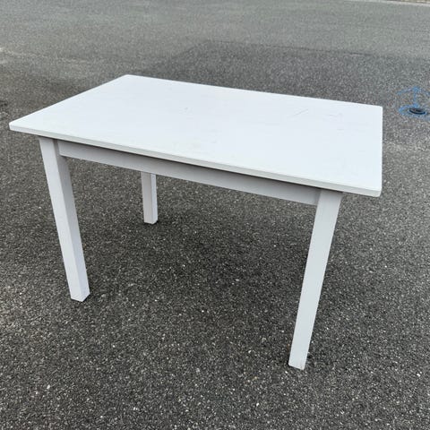 IKEA børnebord i hvid farve. Bordet er lavet af træmateriale og designet til børn. Der er nogle små ridser i bordet.