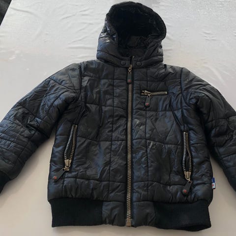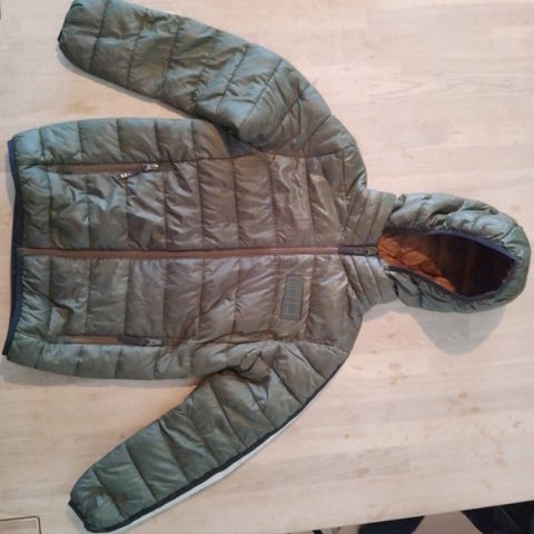 Vinterjakke i str 140 fra Molo. Parka stil i blå/grå/sort armt mønster. Små brugspor på ærmer. Ellers virkelig god stand. 250kr