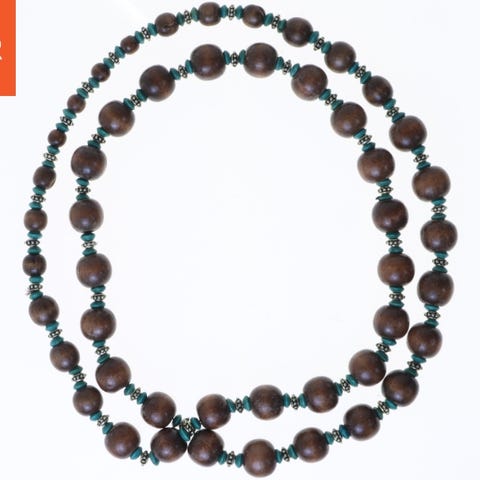En lang halskæde bestående af farverige perler i forskellige former. Perlerne er i nuancer af grøn, orange, gul og brun, og de har en uregelmæssig form, hvilket giver halskæden et unikt og naturligt udseende. Halskæden måler 120 cm i længden og har en lukning i metal.