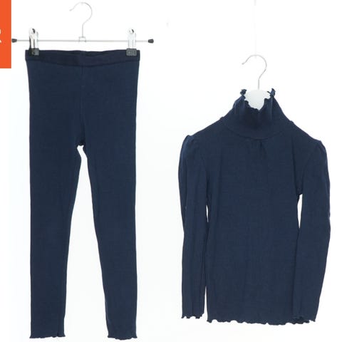 Sættet indeholder en mørkebrun bluse med lange ærmer og høj krave samt et par matchende leggings. Blusen har en let ribbet struktur og puffede skuldre. Leggingsene har elastik i taljen for en behagelig pasform. Begge dele er lavet af blødt materiale.
