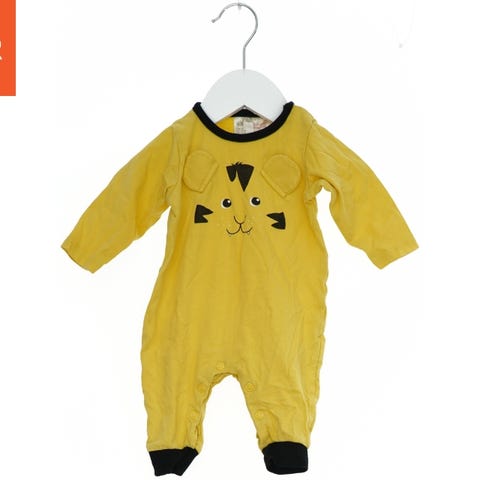 Heldragt til børn med lange ærmer og blomsterprint i beige, lilla og gule nuancer. Dragten har en lynlås foran til nem påklædning.