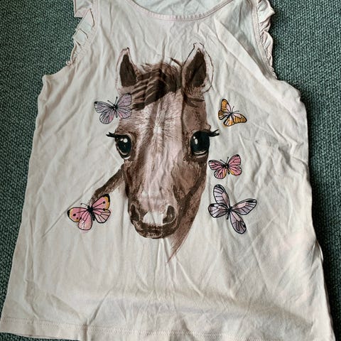 En hvid T-shirt med en illustration af en hvid hest med en blomsterkrans på fronten. T-shirten har en rund halsudskæring med en pink kant. Størrelse 122 er trykt på bagsiden under halsudskæringen sammen med et lille logo.