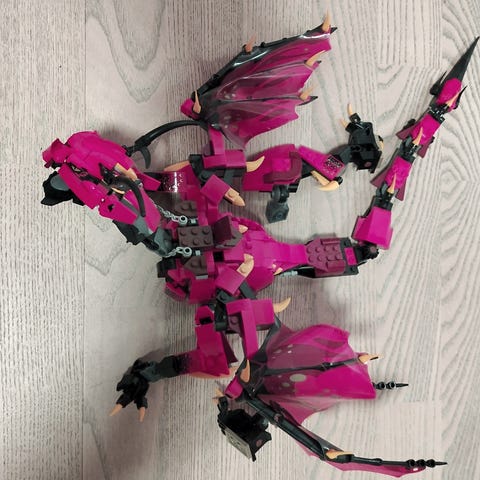LEGO Ninjago drage legetøj med blå farve og tilhørende figurer. Sættet inkluderer en stor drage og flere minifigurer, samt en instruktionsbog. Legetøjet er designet til leg og samling.