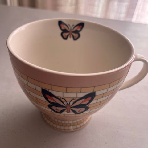 Denne genstand består af en tekop med en underkop. Begge dele er dekoreret med et blomsterdesign i lilla nuancer, og kanterne er prydet med gulddetaljer. Underkoppen har en diameter på 14 cm, og koppen har dimensionerne 7xØ 8 cm. Der ses en producentens mærkning i bunden af både koppen og underkoppen.