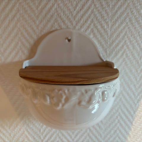 Et vintage saltkar lavet af keramik med tekst ‘Salt og Sult er de to bedste Krydderier’. Det har et trælåg, som kan åbnes. Det runde kar har en diameter på 13,5 cm og er designet til vægmontering med en indbygget ophængningsmulighed. Illustrationen viser en saltkar med en gris over en tønde. Ideel til opbevaring af salt i køkkenet.
