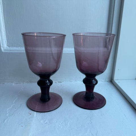 To elegante rødvinsglas med indgraveret motiv af sejlskibe. Glassene har en diameter på 10 cm og en højde på 18,5 cm. De er fremstillet i en ravfarvet glas med klar glasfod, hvilket giver et vintage look. Perfekt til samlere eller som unik indretning.