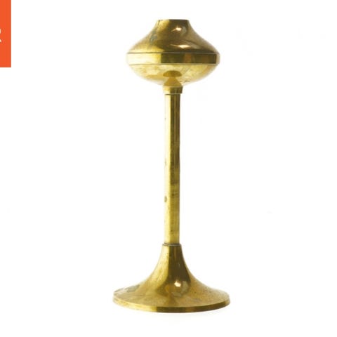 En lysestage lavet af guldmetal med en blank finish. Lysestagen har en rund base og en enkelt holder til et lysestag, der er 7x8 cm i størrelse. Designet er enkelt og elegant, ideelt til hjemmedekoration. Stagen er designet af Asnussen og er fremstillet i Danmark, hvilket fremgår af teksten indgraveret på undersiden.
