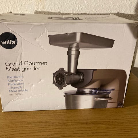 Braun Power Plus 1100 kødkværn med en effekt på 1100 watt. Enheden er hvid og designet til kraftfuld kværning af kød. NYPRIS 1000 KR.