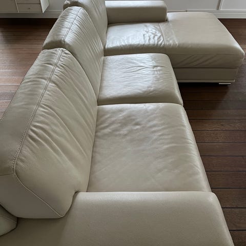 Lækker sofa i gråt skind. Stået i sommerhuset så er ikke brugt så meget
