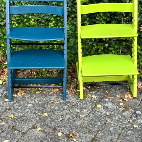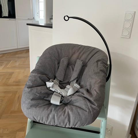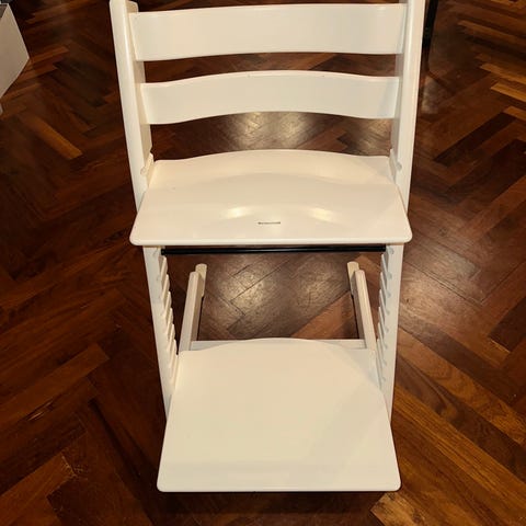 Stokke Højstol i hvid træ. Højstolen er designet til børn og kan justeres i højden for at tilpasse sig barnets behov. Fremstillet i robust materiale med en hvid finish. Indeholder en siddeplade og en aftagelig bakke. Stolen viser mindre brugsspor på Trip trapp med newborn, babyset og bord.