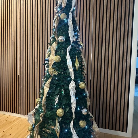 Juletræ med blåligt LED lys imellem to hvidmalede metalplader - skaber en fin silhuet.