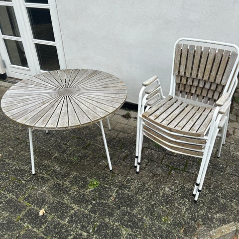 Udendørs bord og stole sæt bestående af et rundt bord med træplanker og metalstel samt stole med trælameller og metalramme. Sættet er velegnet til brug i haven eller på terrassen.