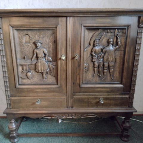 Flot dækketøjsskab i mørkt træ med udskæringer og 2 skuffer