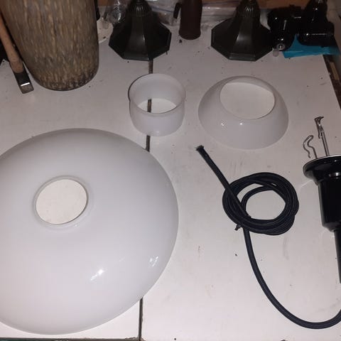 Skærme i mundblæst, hvidt, opalt glas med fatningshus i højglans alu.