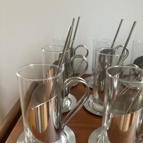 3 gløgg-glas i fletholdere (højde 11 cm) samt 5 coastere i flet (diameter 10 cm). Sælges samlet - prisen er for det hele. Sender gerne for købers regning, men varen kan også afhentes her på Østerbro.
