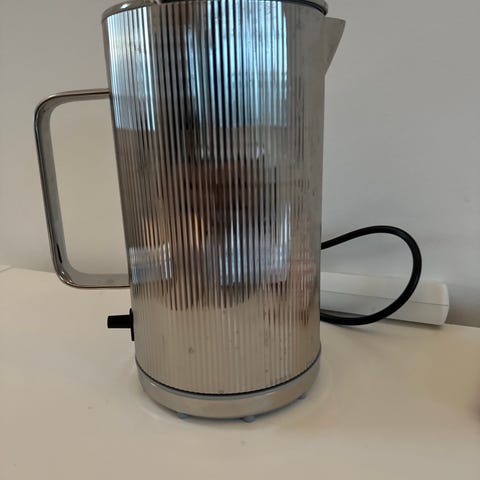 Georg Jensen Bernadotte elkedel i rustfrit stål med karakteristisk rillede overflade og håndtag i samme materiale.