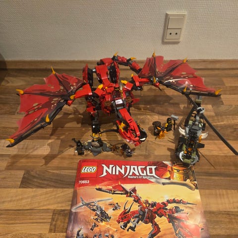 LEGO Ninjago 70653 legetøjssæt indeholder en rød drage, et sort fly og flere minifigurer. Sættet er lavet af plast og er designet til børn til leg og samling.