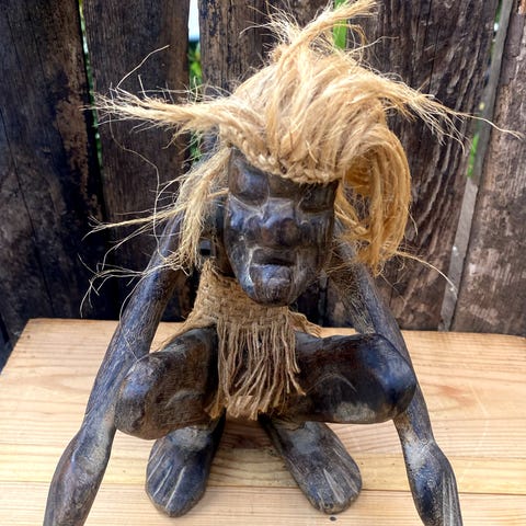 14 hoveder udformet med træk til Afrika. 10 af de flotte hoveder er i træ, 4 af dem (dem øverst th ) er i gips, eller et lignende materiale. Incl. en siddende afrikansk kvinde - figur. Sælges som samling.