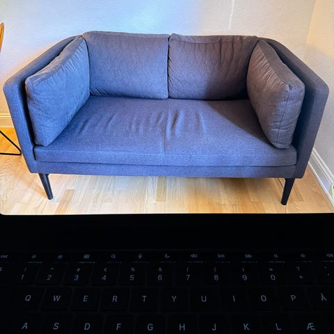 2 personers Grå sofa med træben, egnet til opholdsstue eller kontor. Sofaen har en buet ryg og polstret sæde, designet til komfort og funktionalitet. købt hos sofakompagniet. Sofanavn FLYNN. Designet af Malene Lillelund