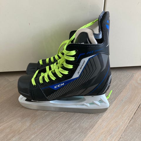 CCM Ishockeyskøjter i størrelse 35. Skøjterne har sort og blå farve med skriggule snørebånd. Designet til ishockey med solide klinger og støttende konstruktion.