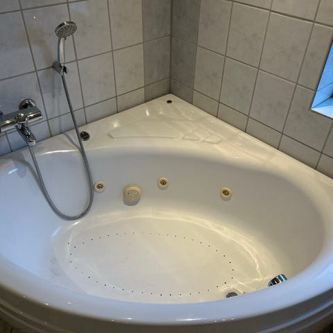 Hjørnebadekar i hvid akryl med ergonomisk form. Designet til installation i hjørne, velegnet til badeværelser med begrænset plads. Materialet er holdbart og let at rengøre.