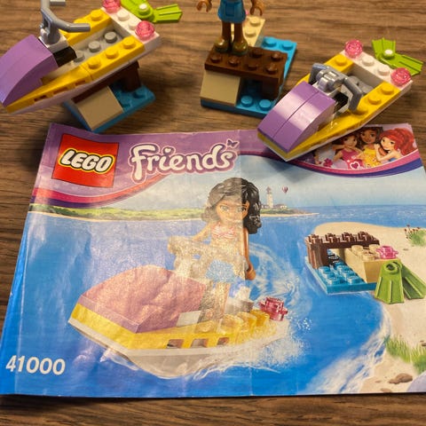 LEGO Friends 41000 legetøj. LEGO Friends tema, beregnet til børn i alderen 5-12 år. Indeholder dele til at bygge en scene med en figur på en vandscooter og tilbehør. Farverne inkluderer lilla, hvid og blå.