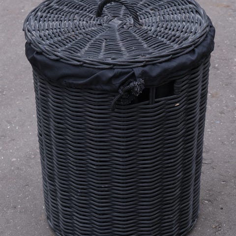 Flettet kurv med låg i naturmateriale. Kurven har en rund form