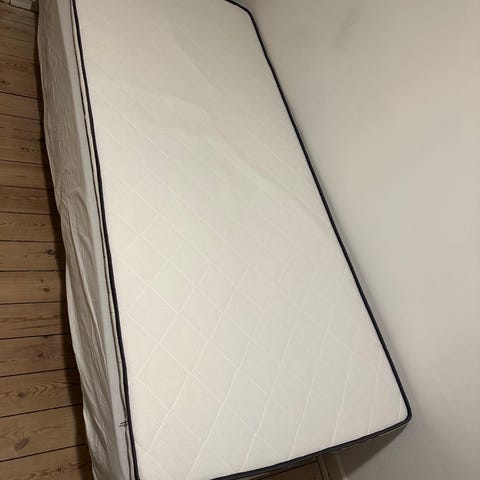 Pæn boxmadrss i blå med original topmadras Stået i vores sommer hus så ikke brugt meget. (Har ikke været lejet ud). Mede ben i bøg medfølger.