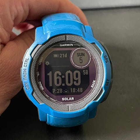 Garmin Instinct 2 Solar GPS ur med solcelleopladning. Uret har en robust sort silikonerem og digital skærm med forskellige funktioner til udendørs aktiviteter og træning.