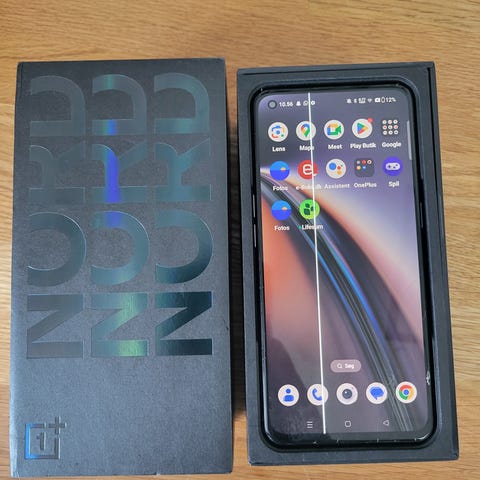 OnePlus 5 telefon, som har lagt i skuffen og ikke været i brug længe. Den er opladet, tændt og navigeret rundt i, og fungerer fint.