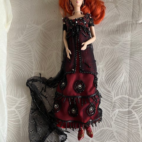 Barbie Faberge PORCELÆNSDUKKE med rød overdel og hvid nederdel, dekoreret med guld- og røde broderede detaljer. Inkluderer tilbehør som sko og smykker. Leveres i original emballage med beskyttende skum og CERTIFIKAT