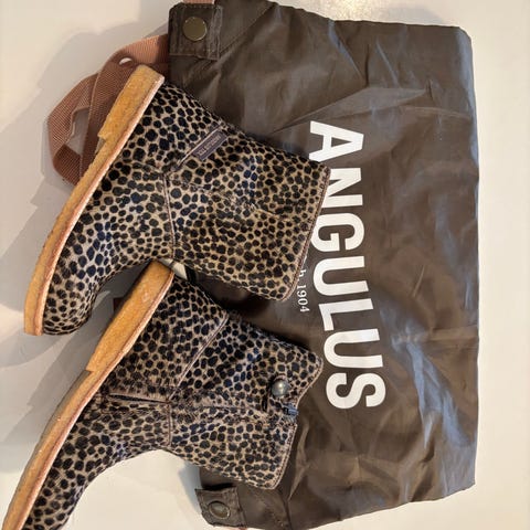 Angulus børnestøvler i størrelse 24 til unisex. Skoene er lavet af sort læder og har varmt lammefor, og lynlås på siden.