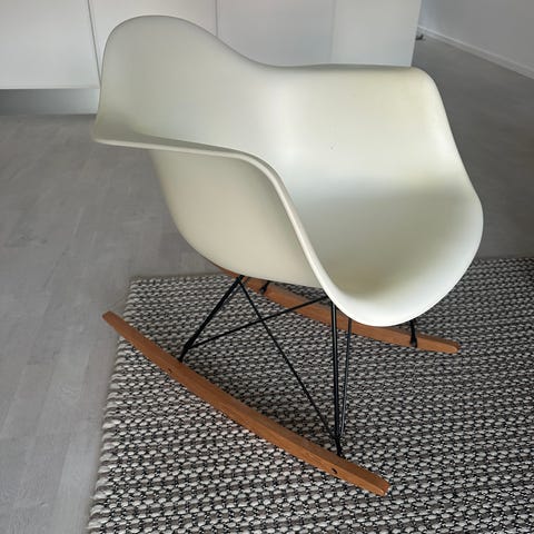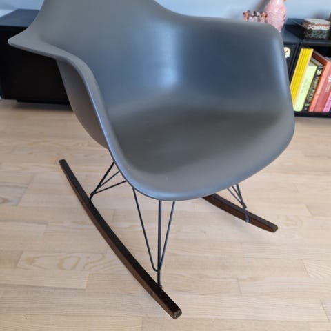 EAMES rar gyngestol. Dueblå plastsæde, metalben og meder i træ.